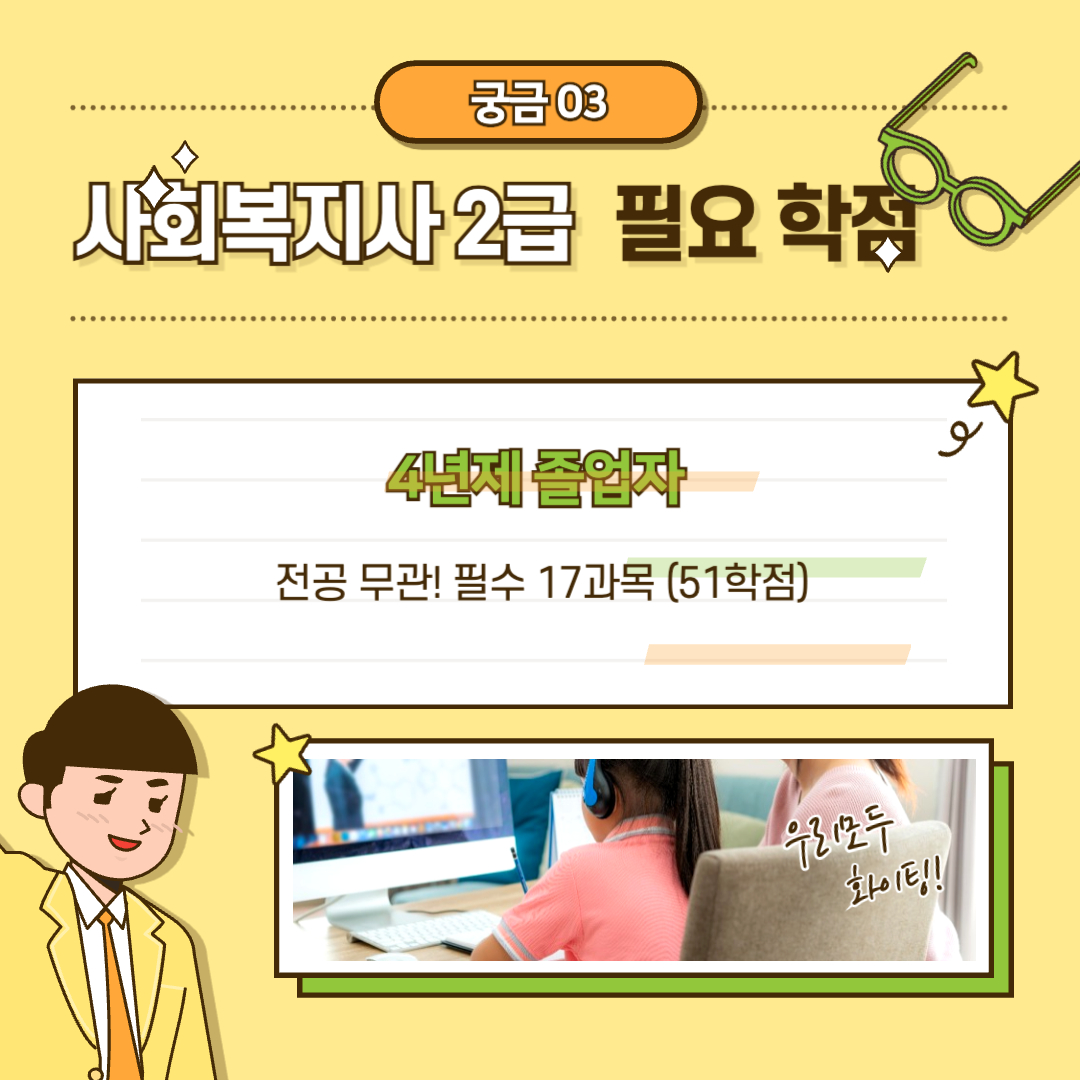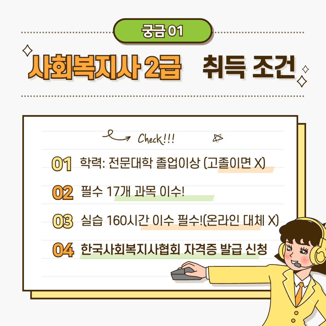 ✔️ 사회복지 관련 학위(학점은행제 포함) 취득 후 이수 과정 필요