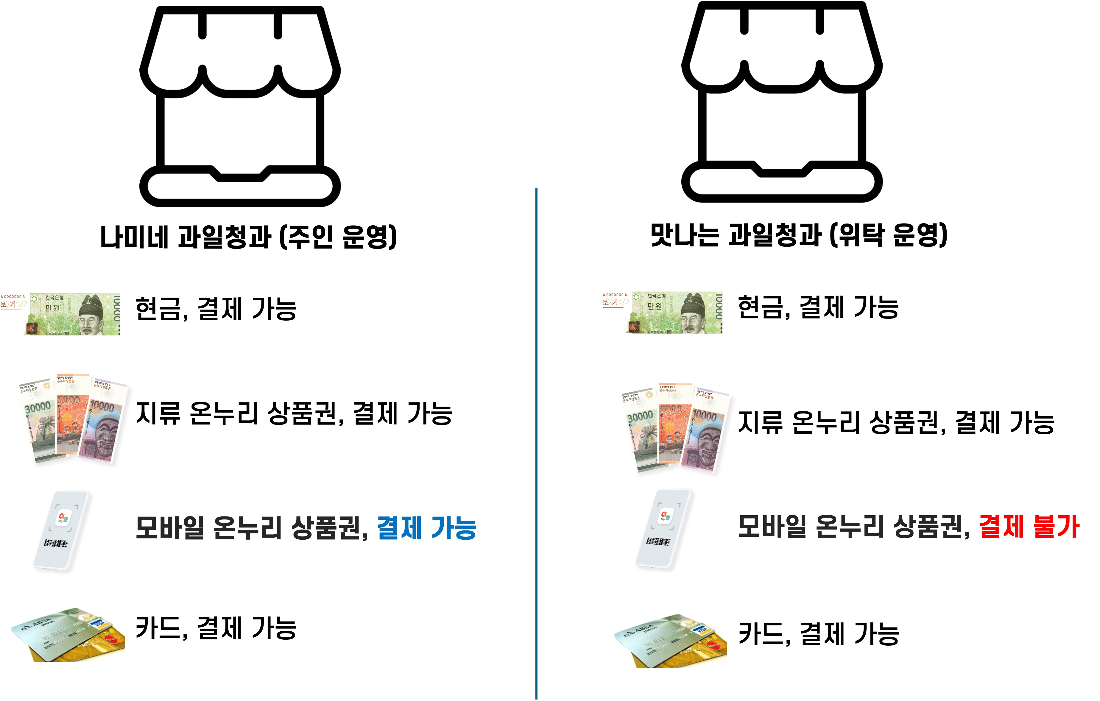 2010년 초반부터 종이 상품권만 받아오던 전통시장 가게들은 모바일형 가맹점 신청을 번거롭게 여기는 경우가 많습니다. 게다가 가게 소유자가 바뀌어도 재신청하는 경우가 드물죠. 또한 일부 가게는 소유주 통장으로 결제금액이 정산되는 방식이 불리하다고 판단해 의도적으로 가맹을 꺼리기도 합니다.(시장에 가게들은 주인이 하는 것보다 의외로 월세로 위탁영업을 하는 곳이 많아요.)