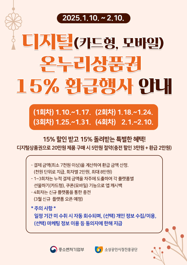 25년 설날 기간에 맞춰 1월 10일부터 2월 10일까지 15%할인된 금액으로 디지털 온누리 상폼권을 구매할 수 있어요.