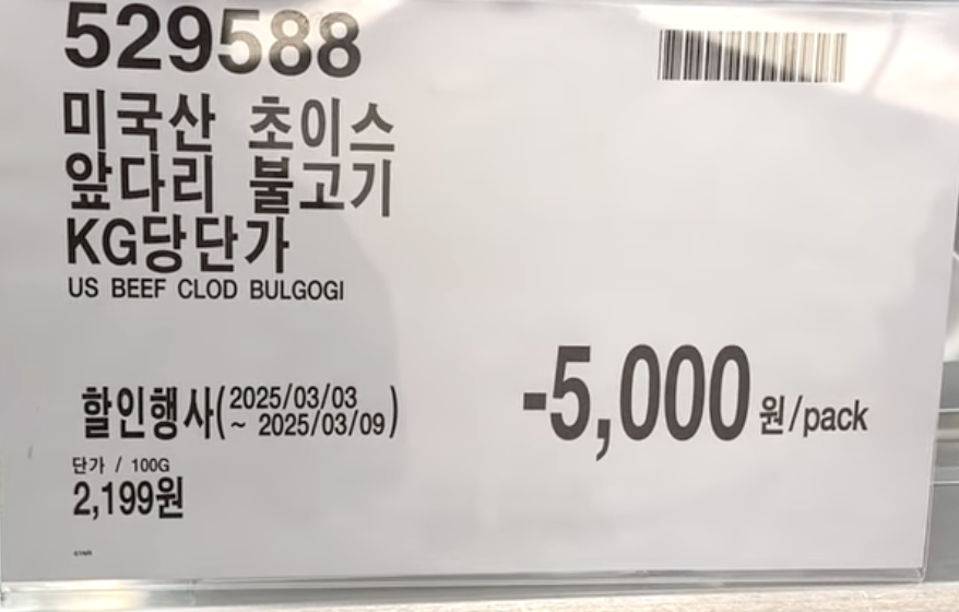 | 미국산 초이스 앞다리 불고기 | 미국산 | 2,199원/100g | -5,000원 할인 | 3월 9일까지 |