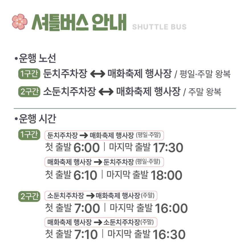 ✔ 둔치 주차장 ↔ 매화축제 행사장 (평일·주말 운영)